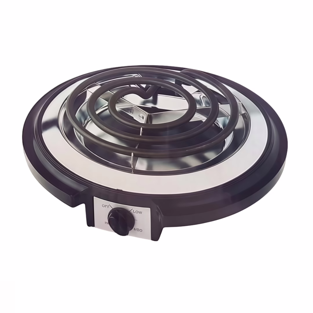 - Un solo quemador eléctrico, ideal para calentar líquidos o porciones pequeñas.